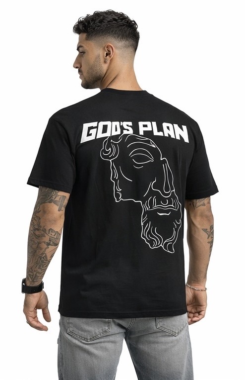 Black oversized T-shirt by Driplet Clothing featuring a clean logo print on the front and a bold “GOD’S PLAN” graphic with minimalist Buddha line art on the back. Designed for a relaxed streetwear fit with a strong, statement-driven vibe.